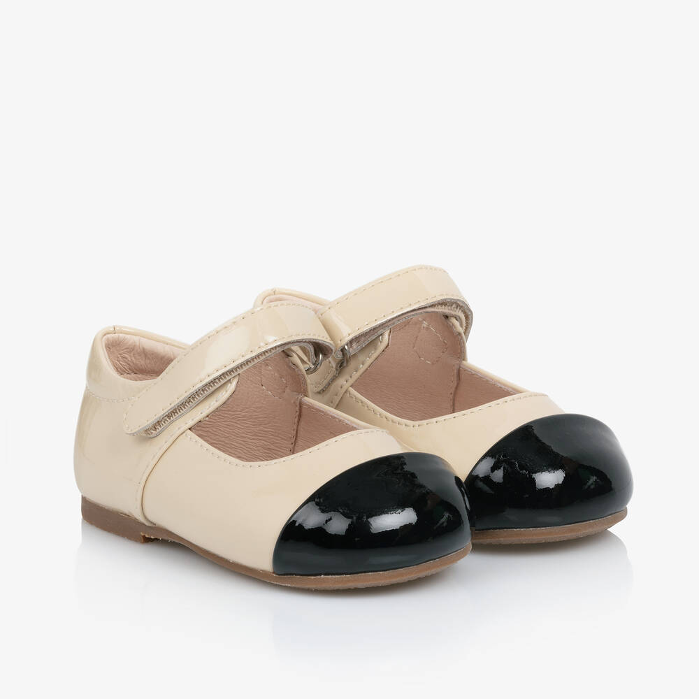 Lovely beige and black shoes for baby girls by Age of Innocence, handcrafted in glossy patent leather. Comfortable on little feet, they have a soft leather lining, a lightly cushioned insole and high back for extra support. They secure across the foot with a velcro strap and have a non-slip rubber outer sole for good grip.