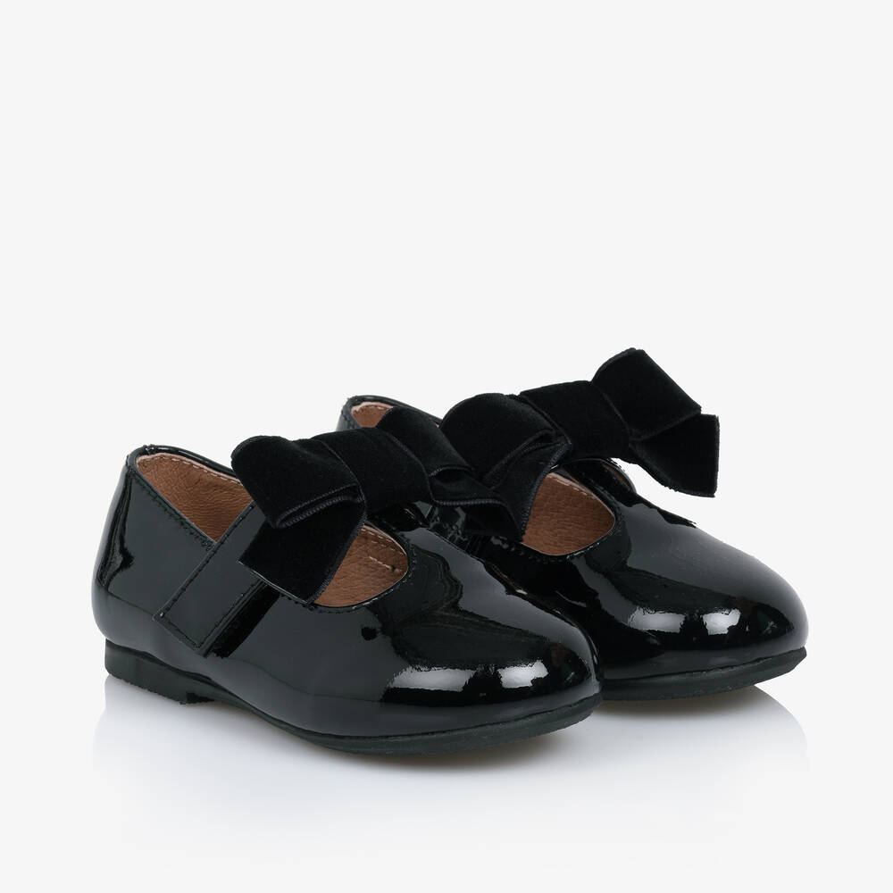 Delightful black T-bar style shoes for baby girls by Age of Innocence, handcrafted in supple patent leather. Beautifully glossy, this pretty style has a velvet bow decorating the velcro fastening strap. They are comfortably lined in soft leather, with a lightly cushioned insole and non-slip rubber outer sole providing good grip.