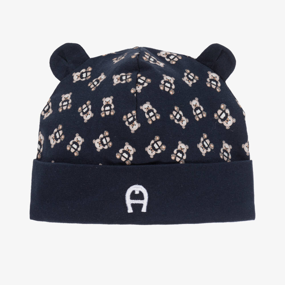 Navy blue hat for baby boys by AIGNER, made in super soft and stretchy Pima cotton jersey. It has a cute all-over beige teddy bear print, with the brand's signature 'A' horseshoe logos in navy blue. There is a matching white embroidered logo on the turned-up brim and sweet 3D teddy ears on the top.