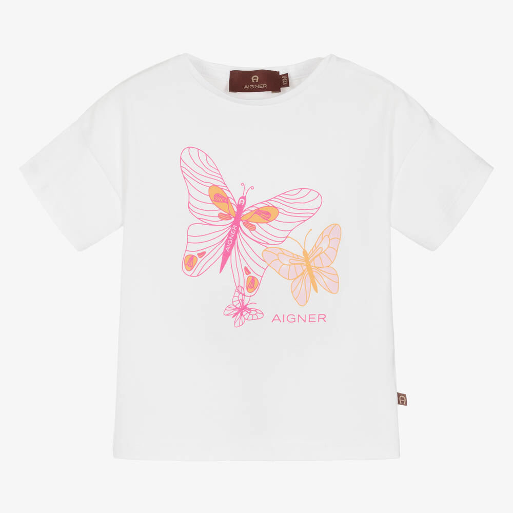Comfortable white cotton T-shirt for baby girls by AIGNER, made in soft, stretchy jersey. It has a pretty butterfly and logo print on the front in shades of pink and pale orange.