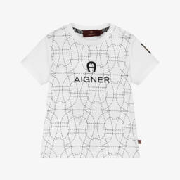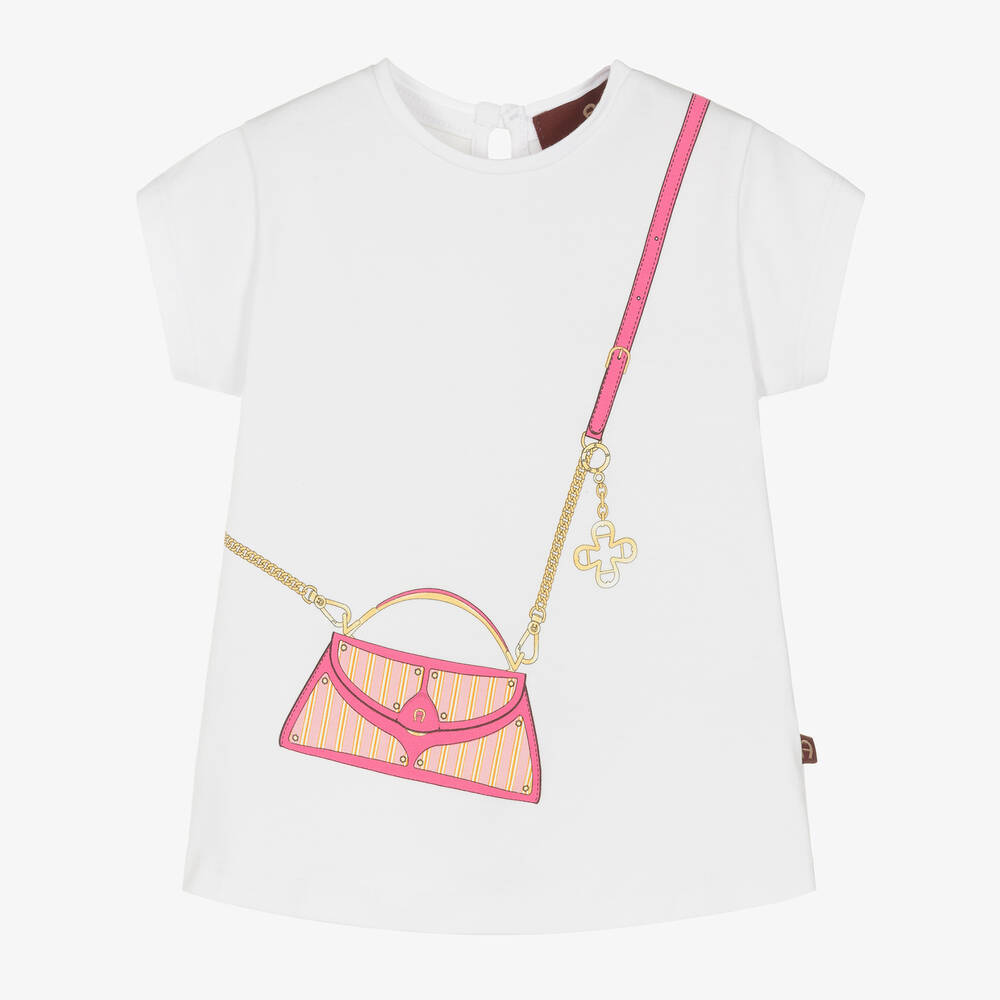 Baby girls white T-shirt by AIGNER, made in soft cotton jersey. It has cute pink trompe-l'œil handbag print across the front with signature 'A' horseshoe logo gold charms, and fastens with a button on the back of the neck.