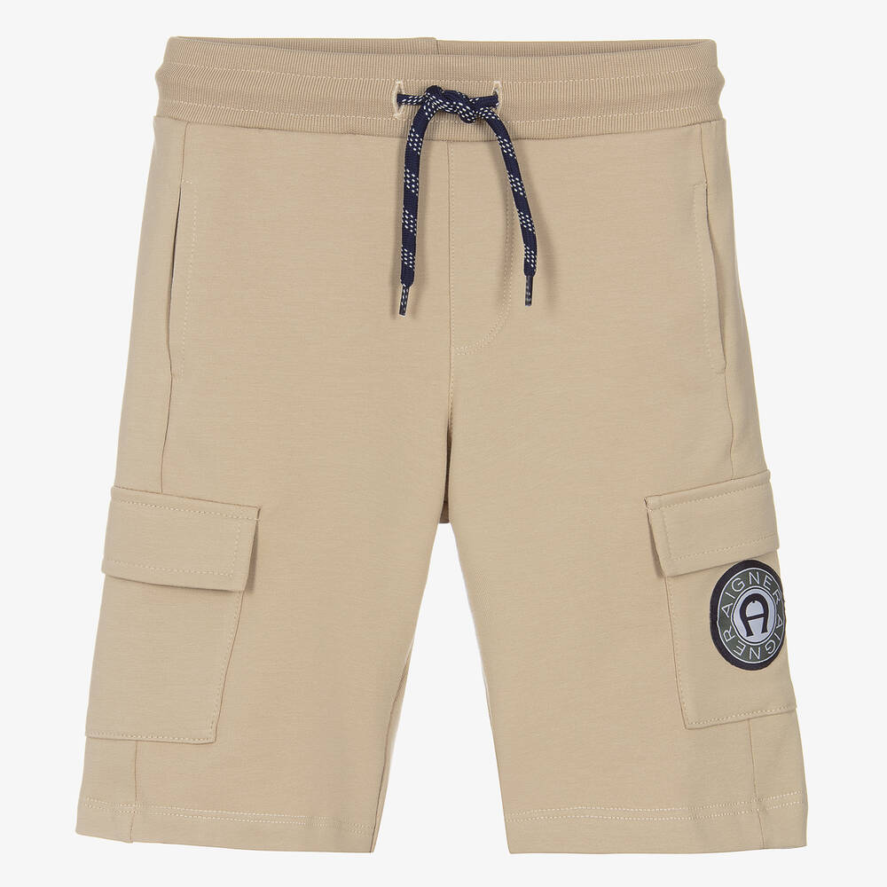 Boys beige cargo shorts from German label AIGNER, made in soft mid-weight cotton jersey. Ideal for comfortable casual wear, these stylish shorts have the brand's signature 'A' horseshoe logo patch on one of the cargo-style pockets. There are further pockets concealed in the side seams and, to ensure a great fit, the stretchy elasticated waistband has useful drawstring ties.