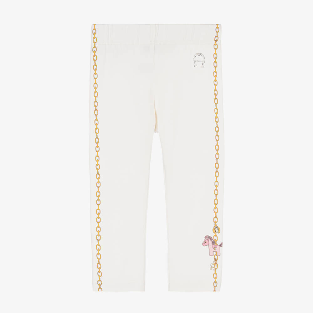 Comfortable ivory leggings for little girls by German label AIGNER. Made in soft and stretchy cotton jersey, they have a sparkly diamante signature 'A' horseshoe logo on the hip for instant designer appeal. Creating a stylish finish, they are printed with a golden chain motif along the legs, incorporating logo details and a sweet pink horse at the ankle.