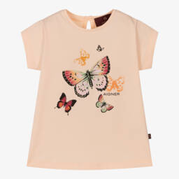Peach pink T-shirt for little girls by AIGNER, made in soft cotton jersey. Casual and comfortable, it features a beautiful butterfly motif on the front in shades of pink and green, with a black logo print. A keyhole button fastening on the back completes the look.