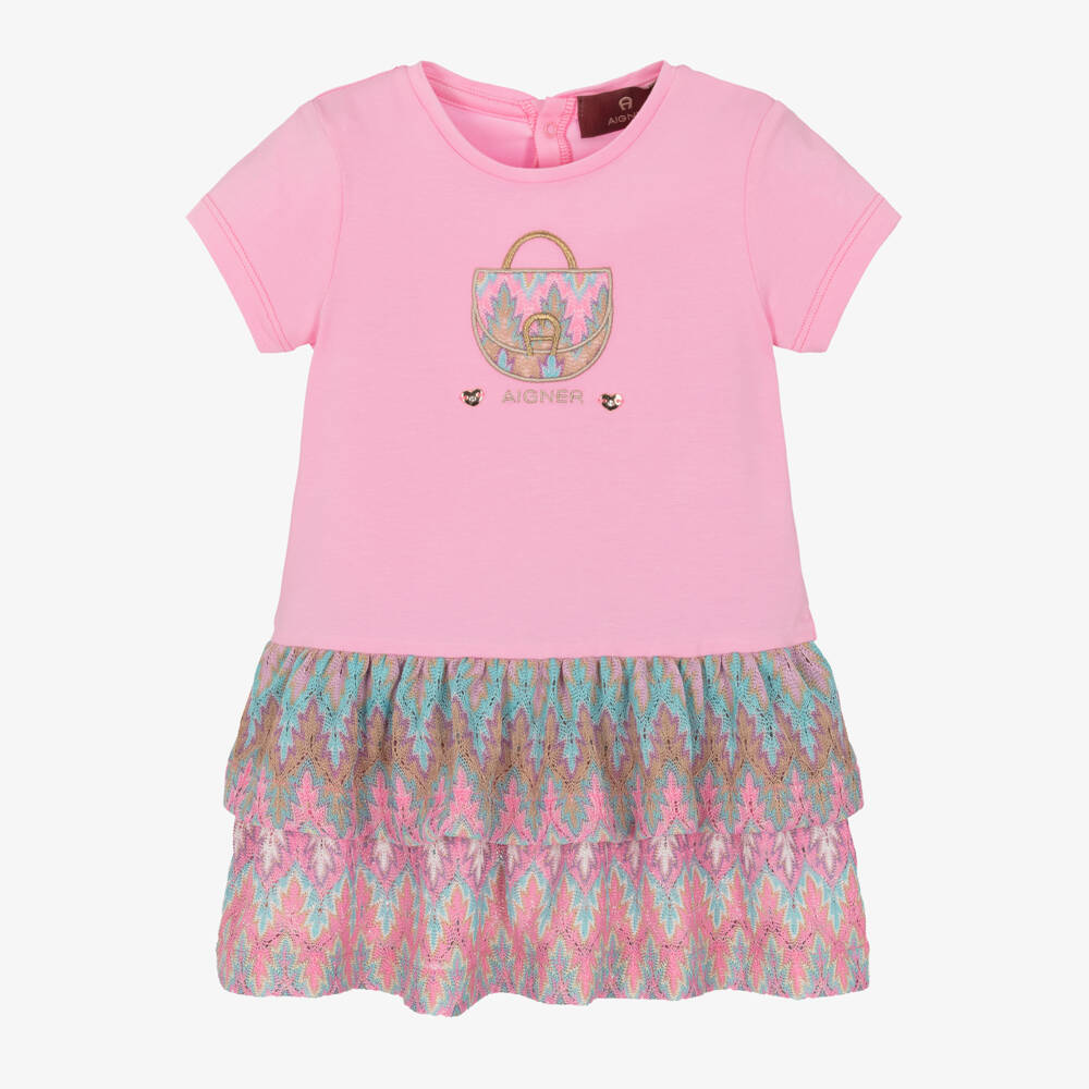 A lovely pink dress for little girls by AIGNER. The bodice is made in soft and stretchy cotton jersey, with an embroidered handbag appliqué on the front, showing the signature 'A' horseshoe logo in gold, and two sparkly golden heart charms underneath. It has a dropped waist with a tiered skirt made from pink and blue finely knitted lace with shimmery gold thread in the beautiful pattern. There are popper fastenings on the back to make dressing easier.