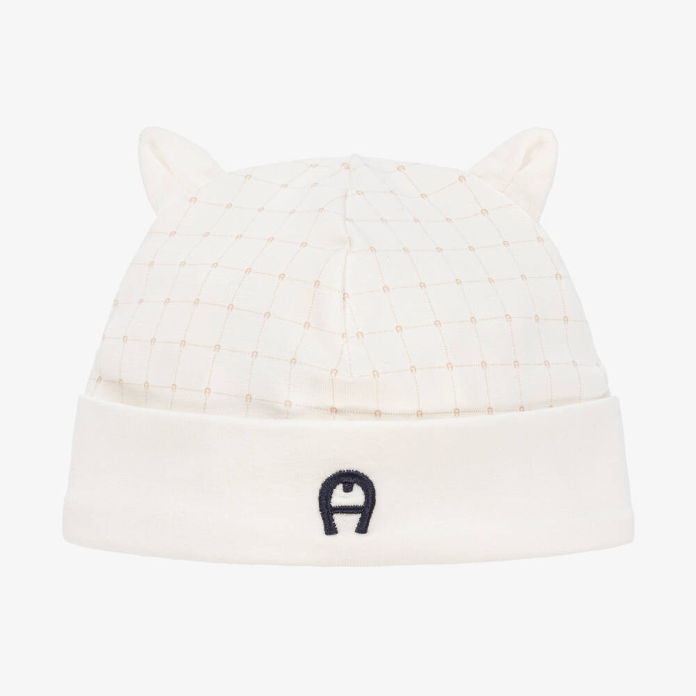Ivory hat for baby boys and girls by AIGNER, made in soft Pima cotton jersey. Patterned with a repeat signature 'A' horseshoe logo, it has an embroidered navy blue logo on the turned up brim and adorable 3D ears on the top. It easily slips onto your little one's head.