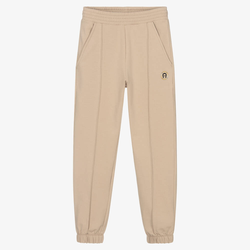 Beige cotton joggers for teen girls by German label AIGNER, with front seam detailing. The brand's distinctive 'A' horseshoe logo is printed on the front in black and gold. These comfortable cuffed joggers are made in soft and stretchy cotton sweatshirt jersey, with an elasticated waistband and convenient front pockets.