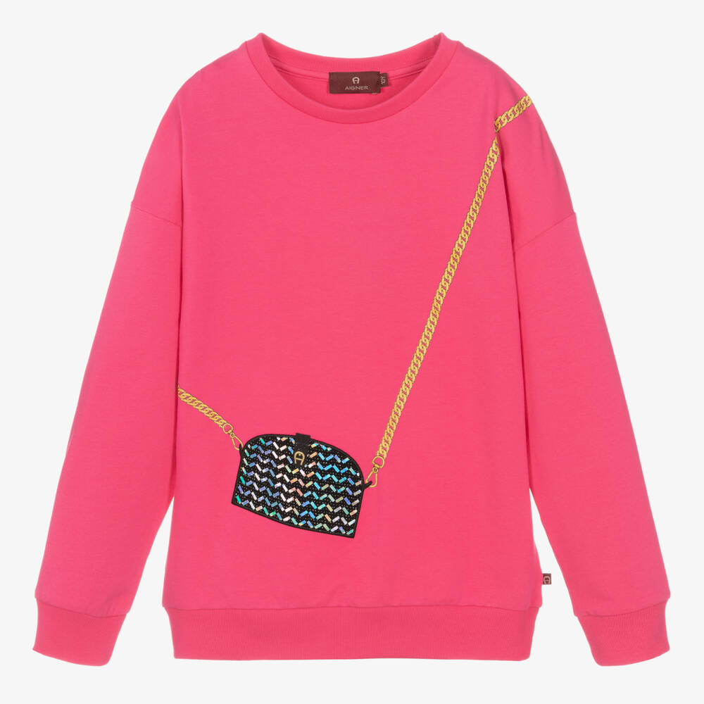 Fuchsia-pink relaxed-fit cotton sweatshirt for teen girls by AIGNER. Decorating the front is a cool trompe l'oeil bag design in black appliqué, with iridescent details, signature 'A' horseshoe logo embroidery in gold, and a chain strap print. Soft and comfortable, it is made in stretchy, lightweight sweatshirt jersey.