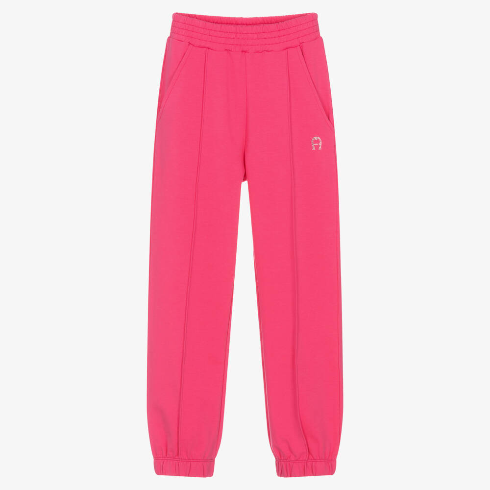 Bright pink joggers for teen girls by AIGNER. They have a stitched seam on the front of each leg and the brand's signature 'A' horseshoe logo in sparkly diamantés on the front. A causal wardrobe staple, with a fun, girly twist, they are made in soft cotton jersey, with a comfortable elasticated waist, slanted front pockets and cuffed ankles.