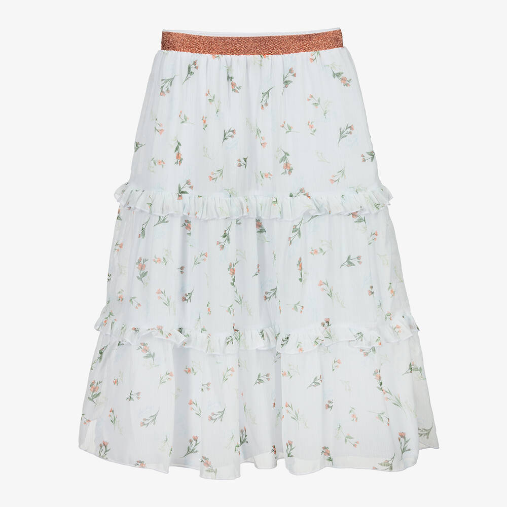 White skirt for girls by AIGNER, made in soft, sheer chiffon with a pretty floral print. There is a soft, lightweight cotton lining, a glittery elasticated waistband, ruffle trims and the brand's signature horseshoe logo on the front in diamanté studs.