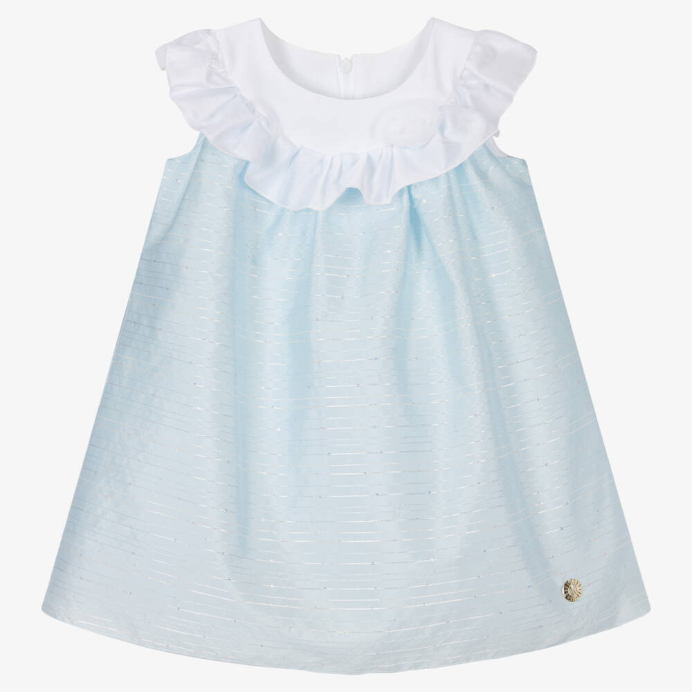 Shimmering with silver stripes and iridescent sequins, this beautiful pale blue dress for girls is by luxury Italian brand Alviero Martini. Lovely for a special occasion, it has a feminine white ruffle collar, trimmed with a pretty organza flower. Fastening with a concealed zip on the back, the dress is fully lined for comfort and has a tulle underskirt for added volume. The designer's gold metal 1a Classe logo is at the hem for a signature finish.