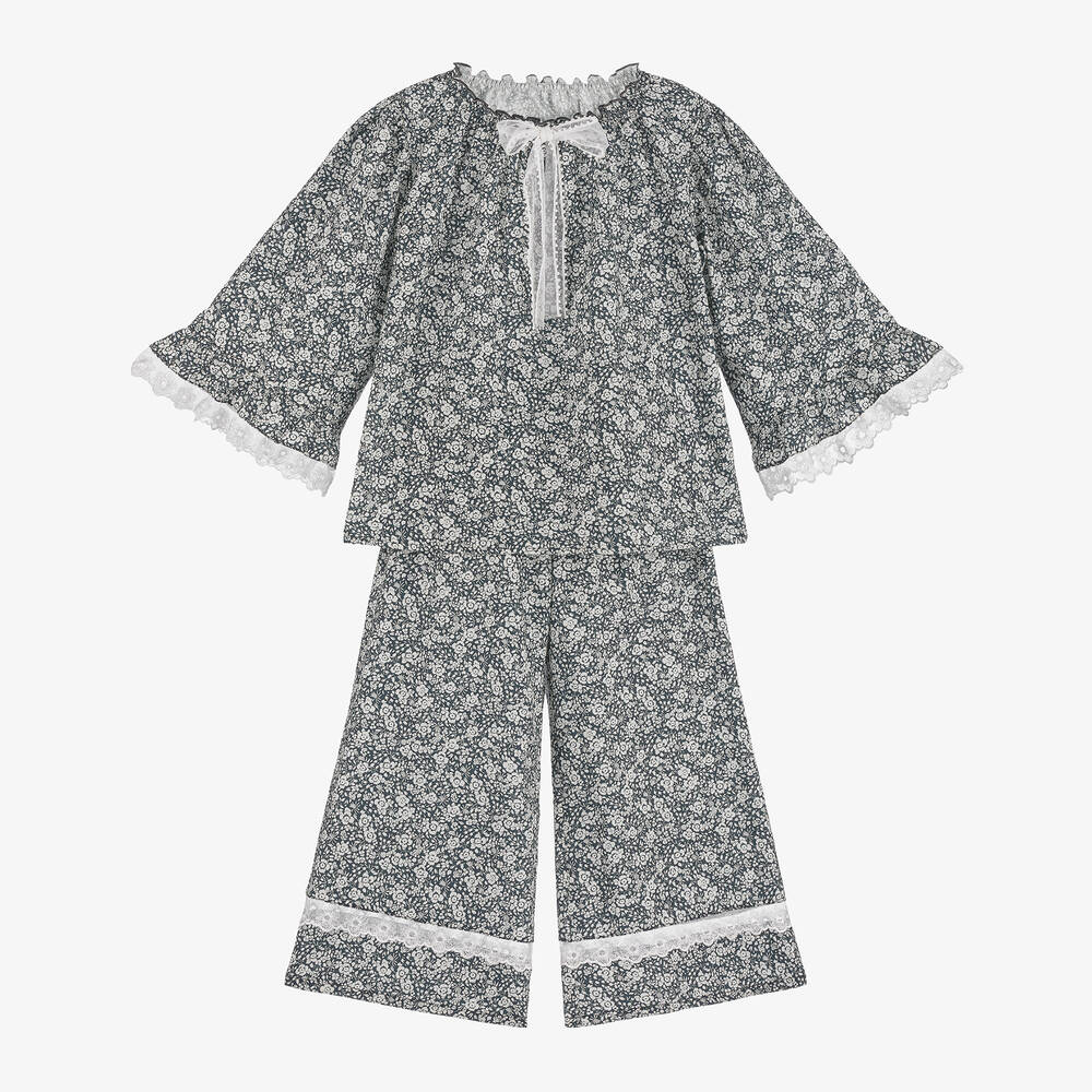 Super soft black pyjamas for girls by AMIKI Children, made in soft, lightweight cotton printed with a white floral pattern. Loose-fitting, the top has a frilled, elasticated neckline trimmed with a white mesh bow and gently elasticated bell sleeves trimmed with delicate white lace. The matching, wide-leg trousers have a comfortable, elasticated waistband.