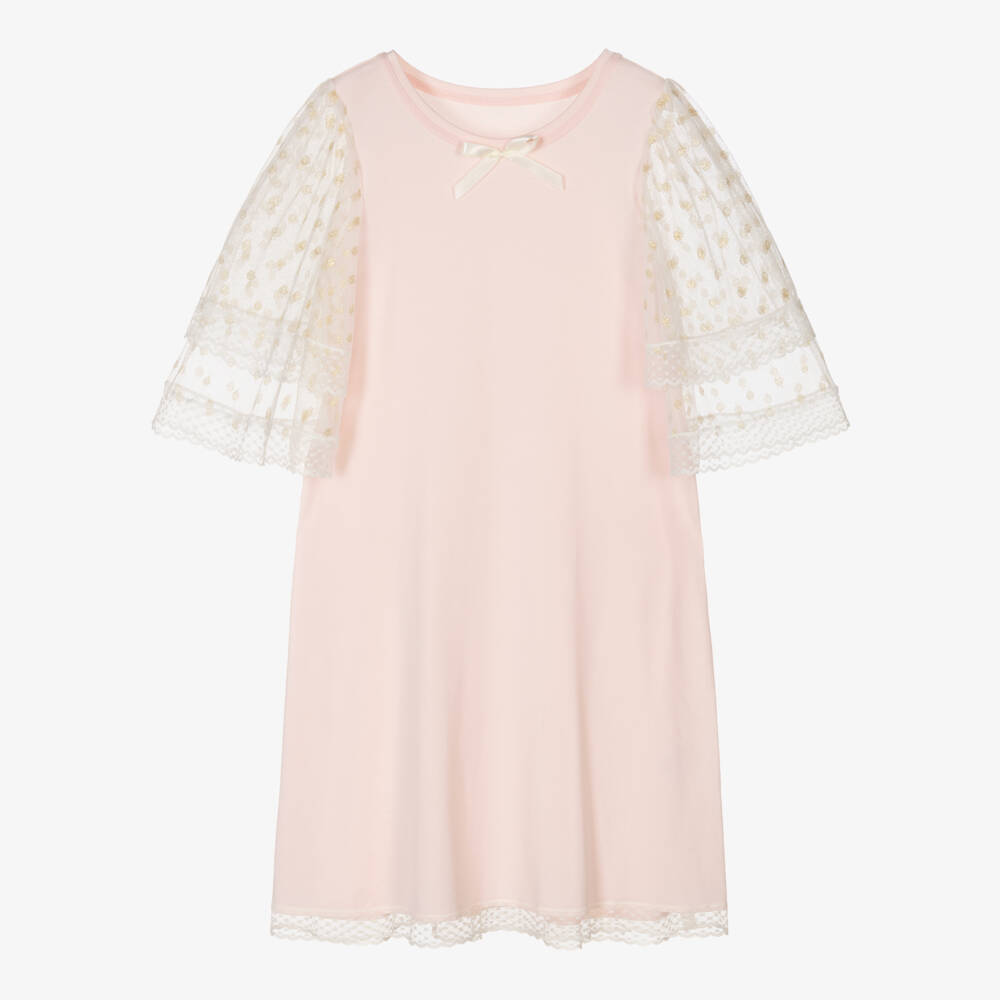 Pretty pale pink long length nightdress for girls by AMIKI Children, made from luxurious micromodal jersey that is soft against the skin. It has ivory tulle sleeves with gold metallic polka dots, and is trimmed with a delicate lace for a traditional look. There is a sweet silky ivory bow on the neckline for an elegant finish.