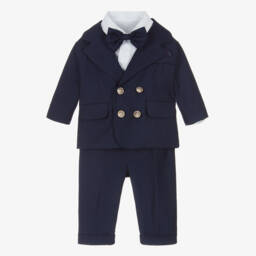White military-inspired suit for little boys by Andreeatex, ideal for a special occasion. The smart velour jacket has gold regalia-inspired accents and tails on the back. The satin trousers have coordinating gold accents and a comfortable, part-elasticated waist. The collared shirt sits neatly underneath the suit, with lace-trimmed cuffs. A puffed velour hat completes the outfit.