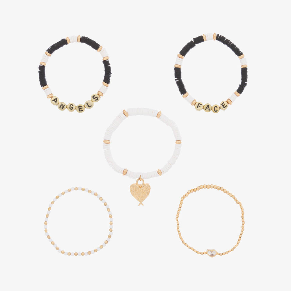 A pack of five bracelets for girls by Angel's Face in stylish shades of black, white, and gold. Ideal for layering together or wearing individually, they feature fun letter beads that spell out the brand name, a diamanté heart, and an iconic angel-wings logo charm. Made from stretchy elastic, they are comfortable to wear and add a pretty finish to any outfit.