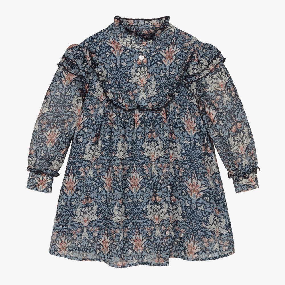 Blue with a pretty pink and brown floral print, this gorgeous dress for girls is by British brand Angel's Face. Made in lightweight chiffon and fully lined for comfort, this elegant design has sparkly silver detailing and feminine ruffle trims. There are shiny silver heart-shaped buttons for fastening.