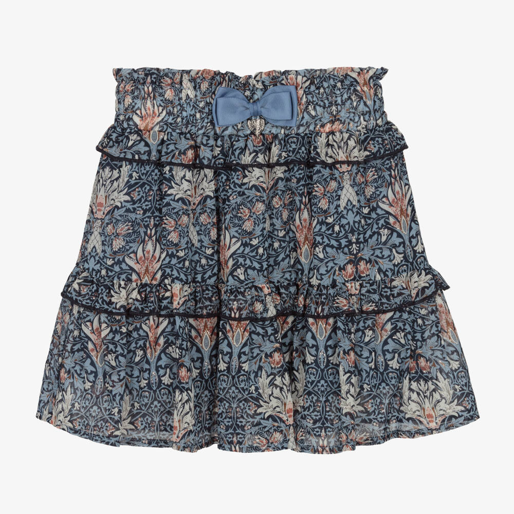 Blue with a pretty pink and brown floral print, this gorgeous tiered skirt for girls is by British brand Angel's Face. Made in lightweight chiffon and fully lined for comfort, it has sparkly silver detailing and feminine ruffle trims. The waistband is elasticated for easy pull on and has the designer's signature silver wings charm and grosgrain ribbon bow on the front.