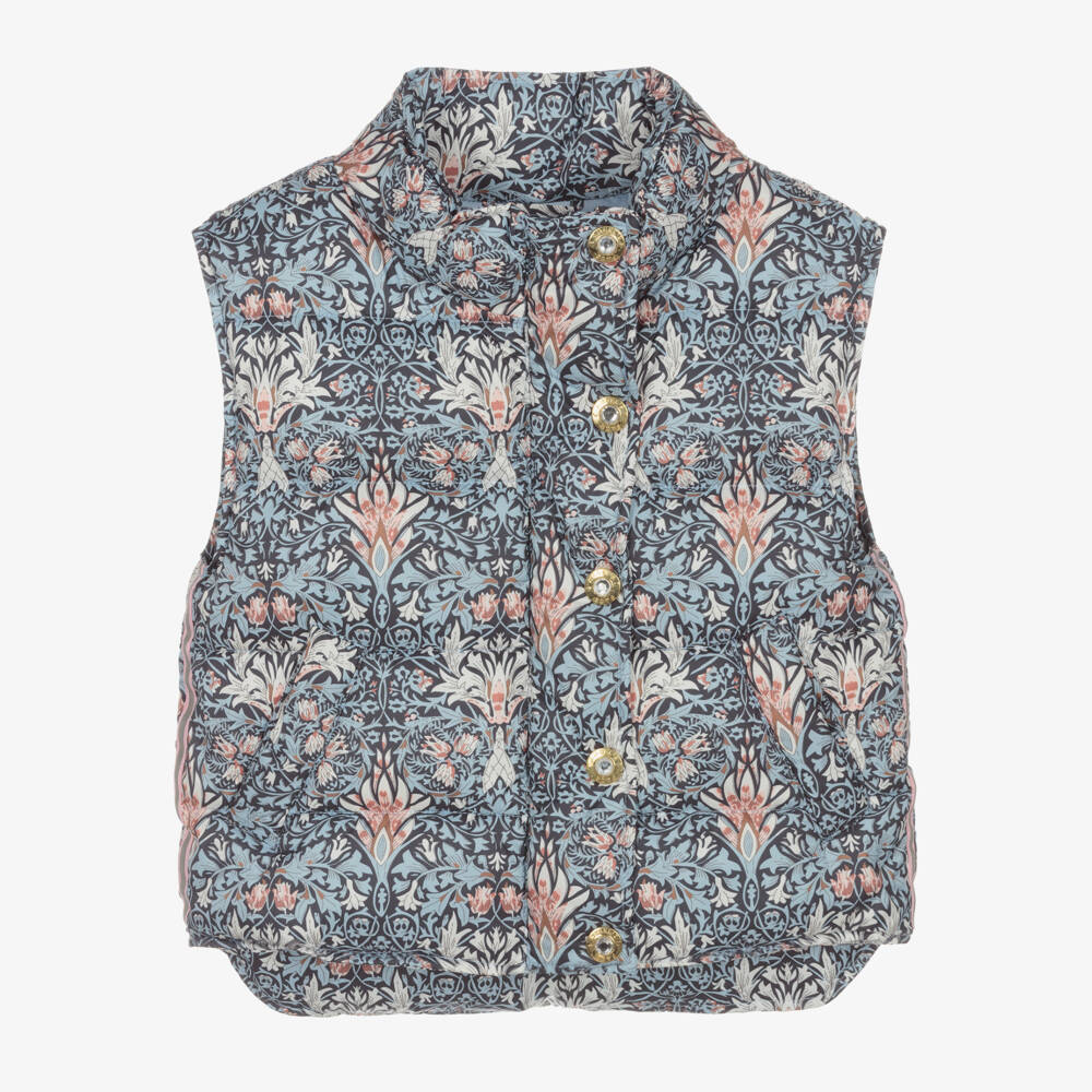 Blue with a pretty pink and brown floral print, this gorgeous puffer gilet for girls is by British brand Angel's Face. There are elegant gold metal poppers down the front, centred with eye-catching rhinestones. Silky smooth and gently padded, this feminine jacket has a concealed front zip fastening, with the brand's signature golden wings charm as a zip puller. There are reflective trims down the sides and useful pockets on the front.