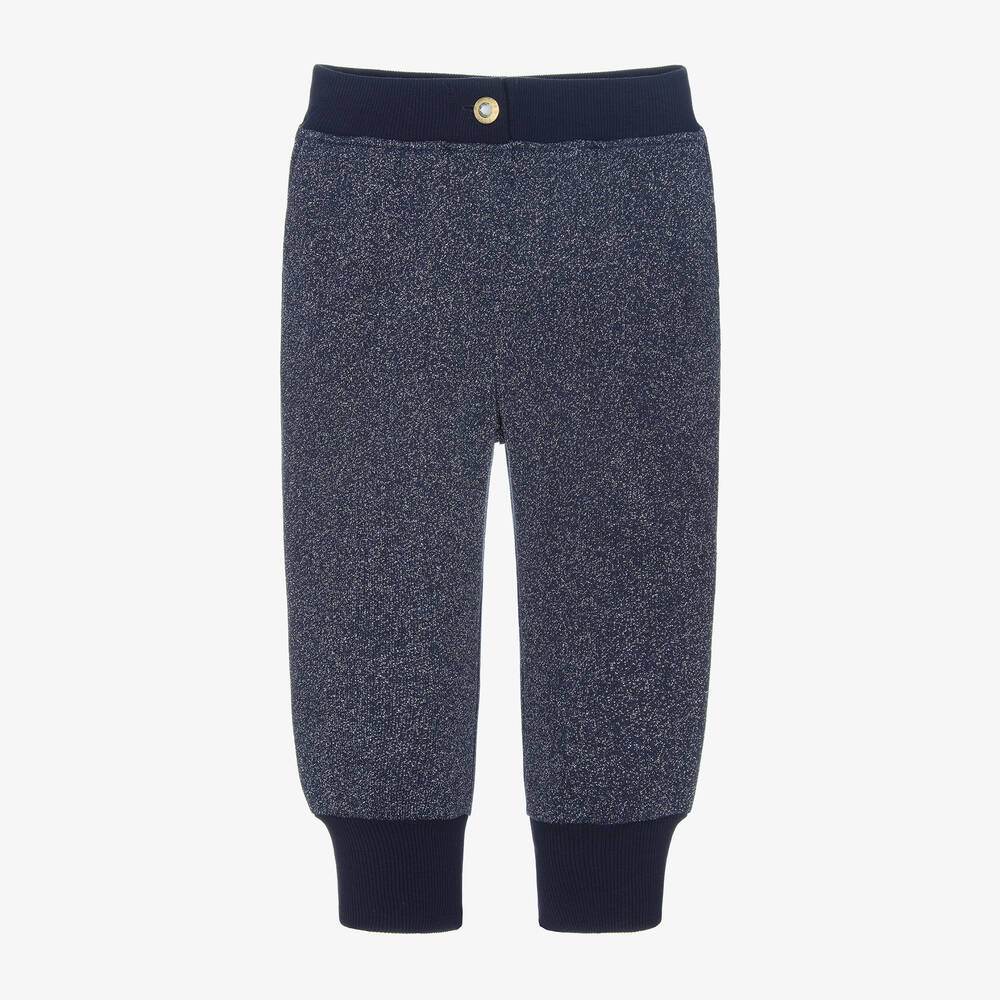 Navy blue joggers for girls by Angel's Face, made in a stretchy jersey knit with a glittery sparkle. They have slanted front pockets and the elasticated ribbed waistband is adjustable for an ideal fit. A shiny gold metal and rhinestone branded button on the front adds a finishing designer touch.