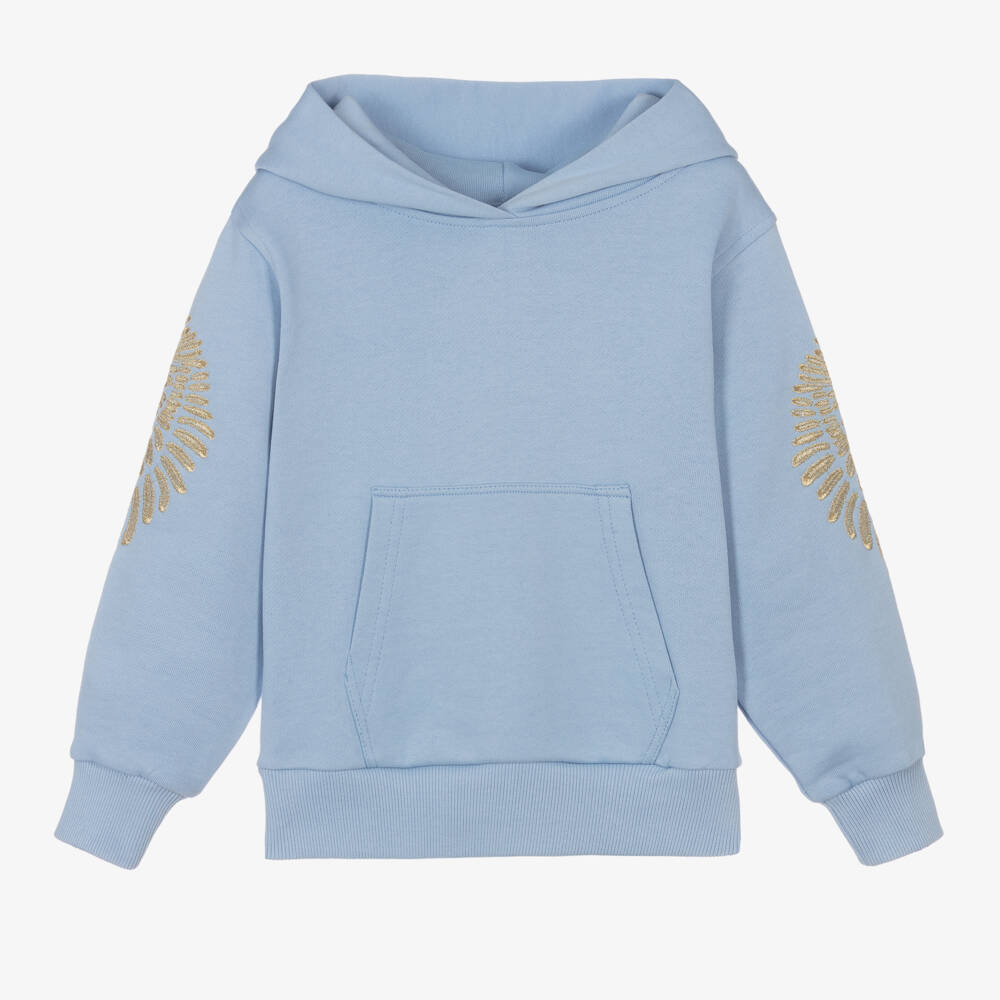 Pale blue hoodie for girls by British brand Angel's Face, with the brand's angel wings embroidered on the sleeves in glittery gold thread. Cosy and warm the hood is lined, there is a pouch pocket on the front for little hands and there are ribbed trims to keep the cold out.