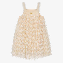 In a lovely shade of champagne ivory, this strappy dress for girls by Angel's Face is ideal for a special occasion. The sheer tulle overlay is embellished with shimmering sequins in a gorgeous fringe effect and there is a signature gold-tone bow and heart logo charm for a touch of sparkle. Lined in comfortable jersey, it has a pretty ruffle neckline and is easy to pull on.