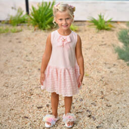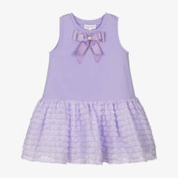 Pretty lilac purple cotton dress by Angel's Face for girls. The soft, comfortable jersey bodice has a large glittery grosgrain bow for a touch of sparkle, with the brand's signature gold heart and bow charm. An ideal choice for a party or special occasion, it has a full chiffon skirt with ruffled trims and a soft voile lining for comfort.