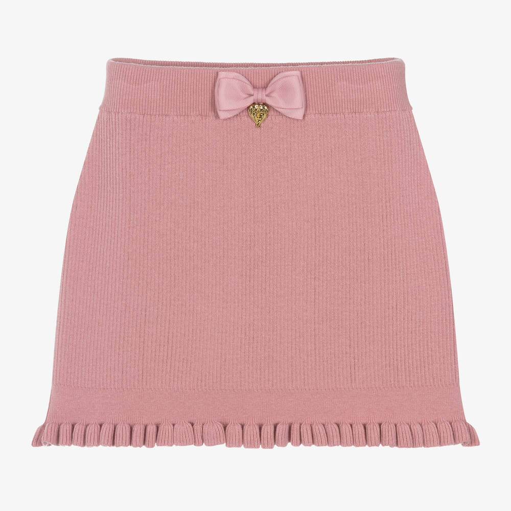 A gorgeous rose pink skirt for girls by Angel's Face, made in a soft, ribbed cotton knit with plenty of stretch. This slim-fitting skirt has an elasticated waistband detailed with a grosgrain bow and gold heart charm. It has a knitted frilled hem, a simple finish that creates a rippled edge.