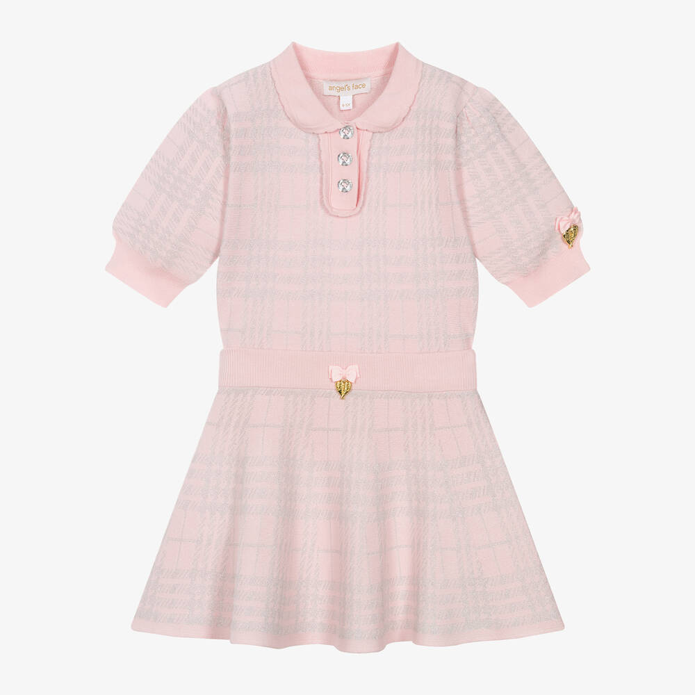 A lovely pink skirt set for girls by British brand Angel's Face, knitted in a stretchy cotton blend. The short-sleeved top has a scalloped collar and clear crystal buttons on the chest. Both pieces are patterned in a timeless check, woven with glittery silver lurex thread and have the signature gold heart charms and grosgrain bows. Creating a complete look, the matching skirt has a stretchy, ribbed waistband and a flared hem for plenty of movement.