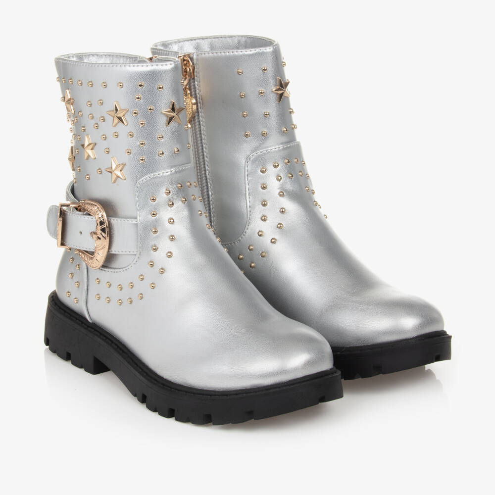 Glamorous silver boots for girls by Angel's Face, made in soft faux leather with golden studs and stars. They have a belt trim with an adjustable, golden buckle for a stylish look. Lined in comfortable fabric, they have a side zip fastening and black non-slip rubber soles.