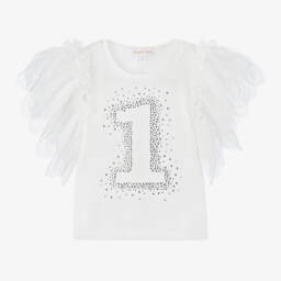 Gorgeous off-white cotton T-shirt for girls by Angel's Face, combining elegance and comfort. Made in beautifully soft jersey, it has a striking black branded bow on the front, whilst the beautiful puffed sleeves have pleated, ruffled cuffs and a tulle lining for extra volume. This top is a versatile staple, suited for both casual outings and more formal occasions.