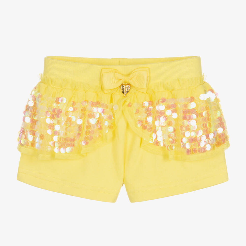 Fun bright yellow shorts for girls by Angel's Face, made in soft cotton jersey. Embellished with the signature heart charm and bow on the stretchy waist, these cute shorts have eye-catching sequin ruffles for a fabulous finish.