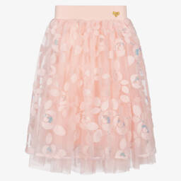 Beautifully sparkly, this bright yellow skirt for girls by Angel's Face, is made in soft jersey, with a fine tulle overlay covered in multicoloured sequins. Both comfortable and stylish it has a ribbed elasticated waistband, trimmed with the brand's heart charm and bow for a signature finish.