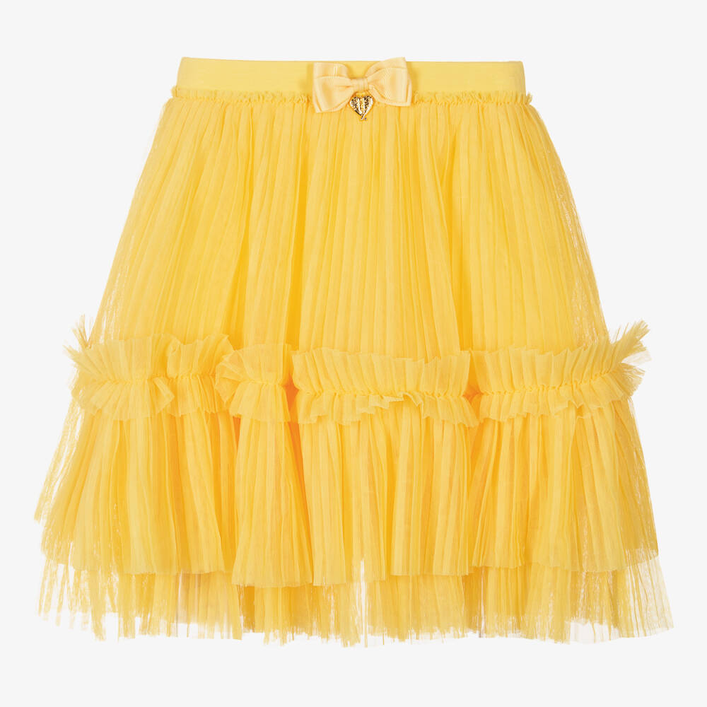 Girls yellow skirt from Angel's Face, made in tiered layers of pleated tulle. It has ruffle trims and a super-soft cotton and modal blend jersey lining. The signature gold heart charm and grosgrain bow is sewn onto the front of the elasticated waistband.
