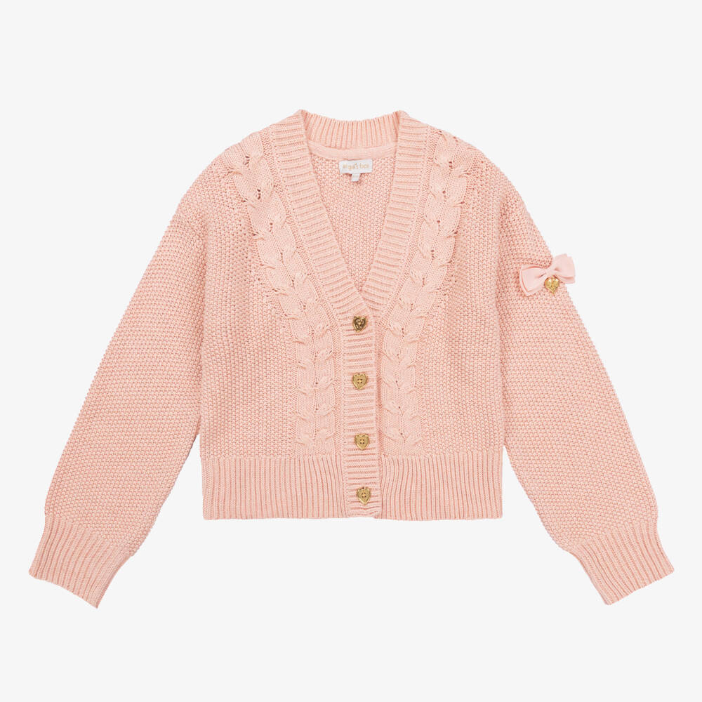 Gorgeous for layering, this glittery pink cotton-blend cardigan for teen girls is from Angel's Face. This stylish V-neck top has cable-knitted detailing, with a grosgrain bow and a signature gold wings charm decorating the sleeve. Gold heart-shaped buttons fasten beautifully on the front.