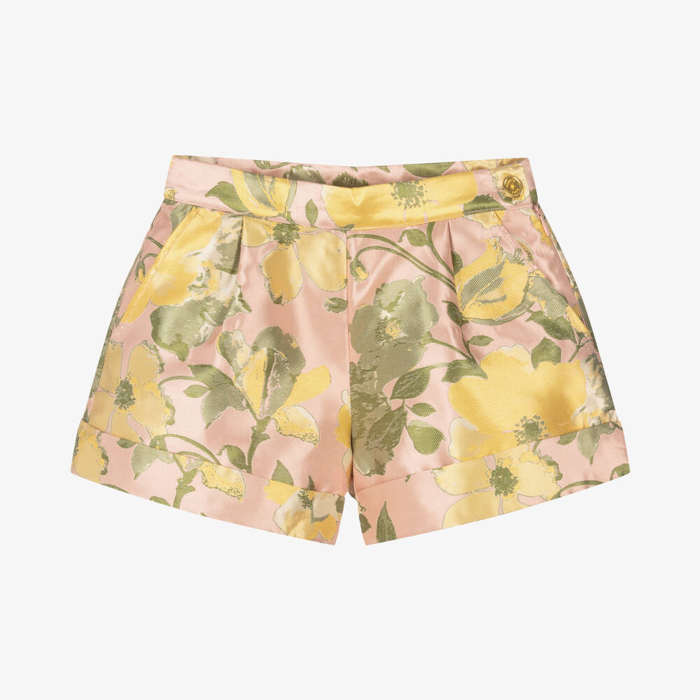 Lovely pale pink jacquard shorts for teen girls by Angel's Face, in a yellow and green floral pattern. So stunning with a subtle sheen, they are styled with soft pleats on the front, two slanted pockets and fixed turned-up cuffs. Fully lined, they fasten with a zip on the side for a seamless look and secured with a branded gold button on the waist.