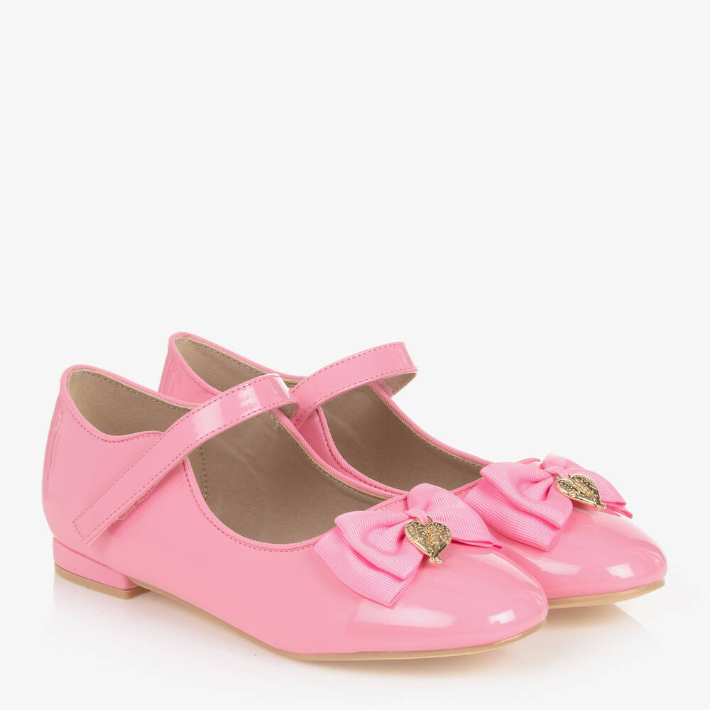 In an eye-catching pink shade, these ballerina pumps for teen girls are from Angel's Face. These shoes are lovely for special occasions, in shiny patent faux leather with a grosgrain bow and signature gold charm on the front. Fastening with a velcro strap, they have a lightly padded faux leather insole and a rubber outsole.