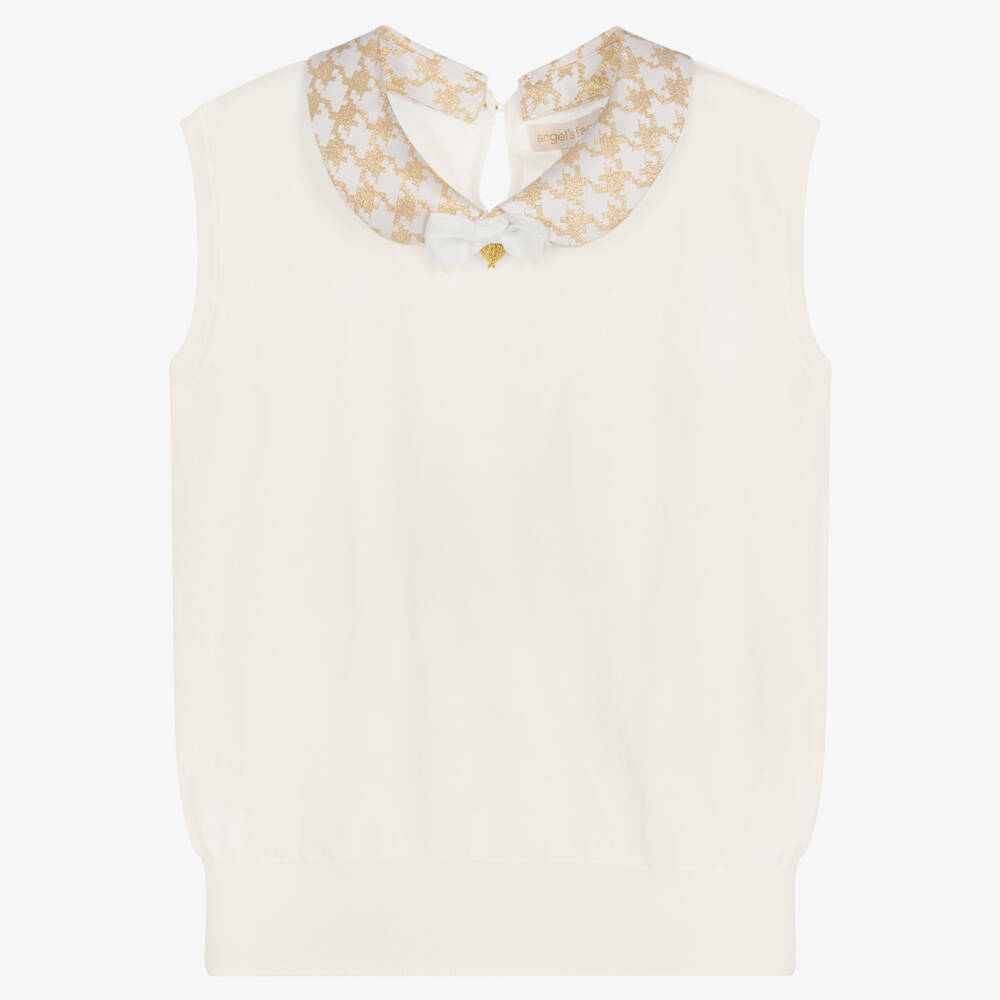 Chic and smart for teen girls, this off-white sweater vest is by Angel's Face. It features a statement ivory and gold brocade houndstooth collar with the signature heart charm and bow on the front. There is a shiny gold button fastening on the back.