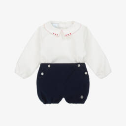 A charming ensemble for keeping cosy on cooler days, this pale blue jacket and hat set for baby boys is by Artesanía Granlei. Softly knitted in a fine garter stitch, the jacket features a classic collar and a double-breasted button fastening, with a mother-of-pearl logo charm to finish. The matching hat has a delightful pom-pom on top, with knitted ties to secure under the chin.