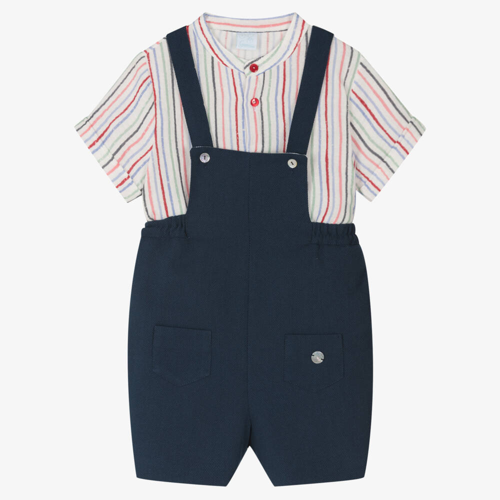 A classically styled shirt and dungaree shorts set for little boys by Spanish brand Artesania Granlei. Made in soft cotton cheesecloth, the collarless shirt is patterned in multicolour stripes and has turned up cuffs. The navy blue piqué-textured shorts are fully lined for comfort and have a gently elasticated waist. The shoulder straps fasten on the front with mother-pearl buttons, and one of the patch pockets is trimmed with a mother-of-pearl logo charm.