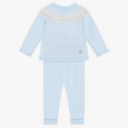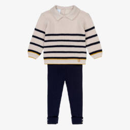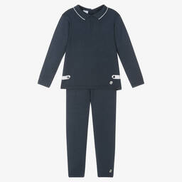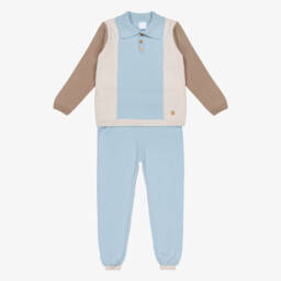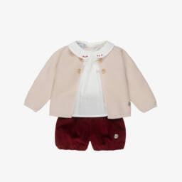 Burgundy red trouser set for little boys by Artesanía Granlei, exclusively for Childrensalon. Finely knitted for a soft and cosy feel, the top features a charming white Peter Pan collar and button fastenings on the back, whilst the trousers have an elasticated waist that is adjustable for comfort. Both pieces are complete with a pearly logo charm.
