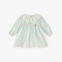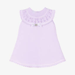 Combining elegance and comfort, this lovely pink dress for girls is by Artesanía Granlei. Made in a soft ribbed knit, the bodice has delicate scalloped trims and satin ribbon detailing, finished with a knitted bow and mother-of pearl logo charm. Lined in lightweight voile, the cotton twill skirt features a delicate floral pattern in pink and green for a touch of vintage charm.