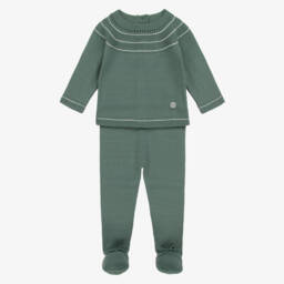 Green two piece babygrow for boys and girls by Artesanía Granlei, finely knitted for a soft, cosy feel. The top has a contrasting white stitched trim and back button fastenings, while the trousers have a gently elasticated waistband and enclosed feet, trimmed with bows. Both pieces feature the brand's signature mother-of-pearl logo charms.