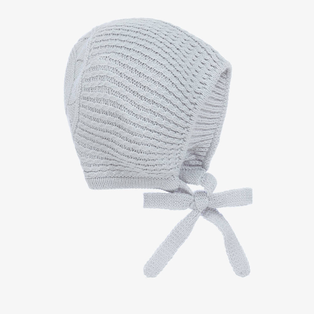 A grey knitted bonnet for baby boys and girls by Artesanía Granlei. This classic accessory has a lovely cable-knit design, an intarsia flower on the crown, and a mother-of-pearl logo charm on one side. It has ties under the chin to keep the hat secure on his or her little head.