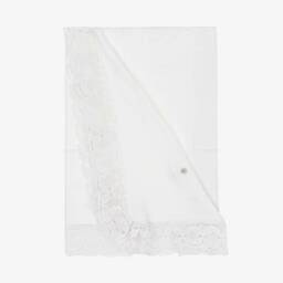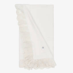 Beautiful off-white shawl for baby boys and girls from Artesanía Granlei. Made in a delicate, lightweight cotton blend with an attractive lace-knit border, it has a charming, intricate lace trim. Ideal for presenting baby to family and friends, this versatile accessory can also be used in the nursery.