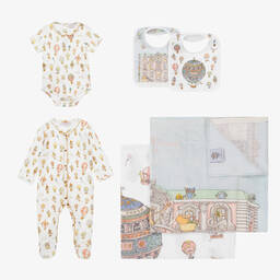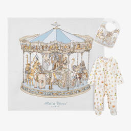 Ivory and pink babysuit set for girls by luxury French designer Atelier Choux Paris. A charming gift for newborns, both items are patterned in colourful and traditional sweet treats. The delicate cotton jersey bodyvest has a gold trim around the neckline and popper fastenings between the legs. An organic cotton swaddle is included, which is lovely for use as a breathable blanket or for privacy whilst breastfeeding.