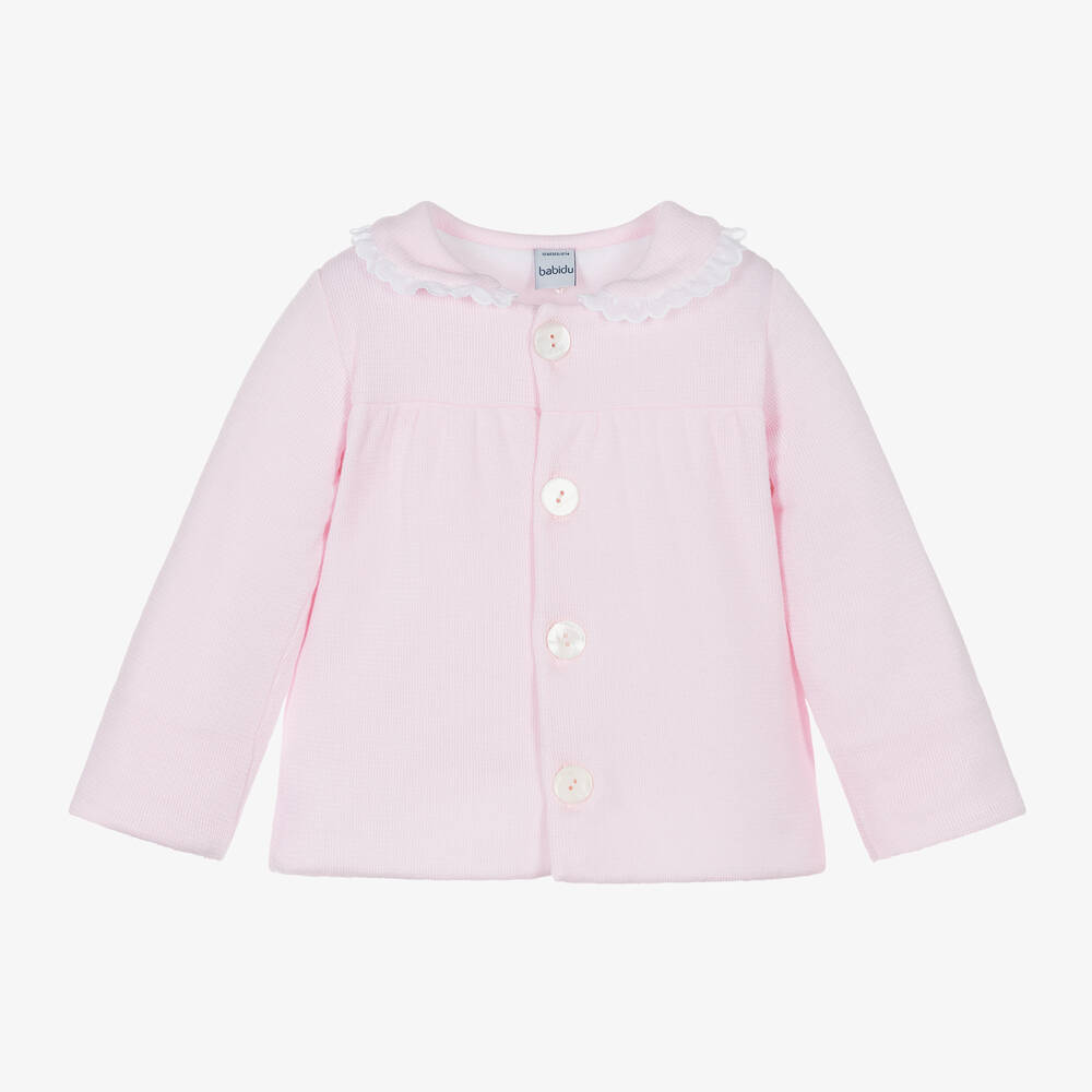 Cute pink pram coat for baby girls by Babidu, knitted in soft cotton. This sweet style has a ruffle collar, warm padding and a soft jersey lining. There are button fastenings on the front, completing the look with a classic touch.