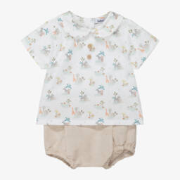 A green and beige cotton shorts set for little boys by Babidu. With faux wooden button fastenings on the front half-placket, the green and red tartan shirt is made in soft, lightweight twill. The corduroy shorts have useful side pockets and a semi-elasticated waistband for comfort. Easy to wear, they simply pull up.