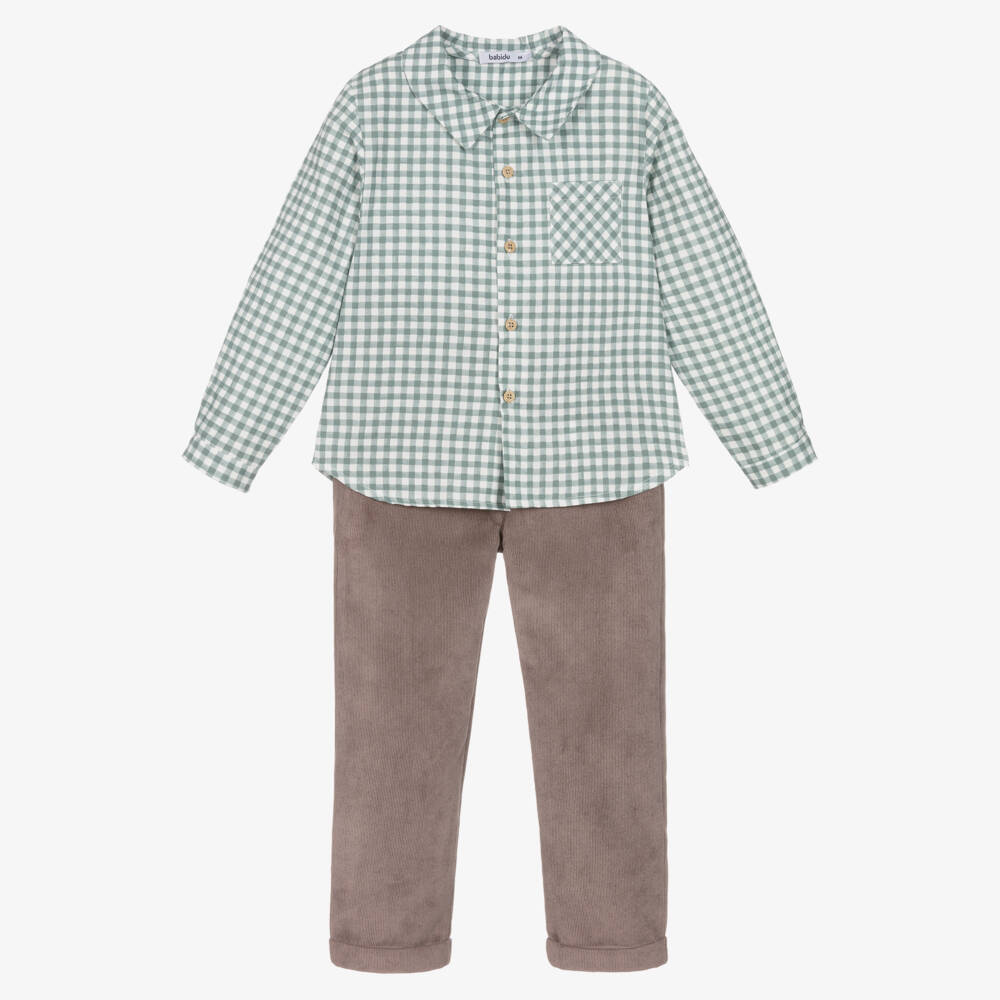 Green, white and brown trousers set for little boys by Spanish brand Babidu. The cotton poplin shirt has a check pattern, a pointed collar and a chest pocket for a casual, classical look. It fastens with buttons on the front. The needlecord trousers have front pockets, an elasticated waist on the back, and turn-up hems.