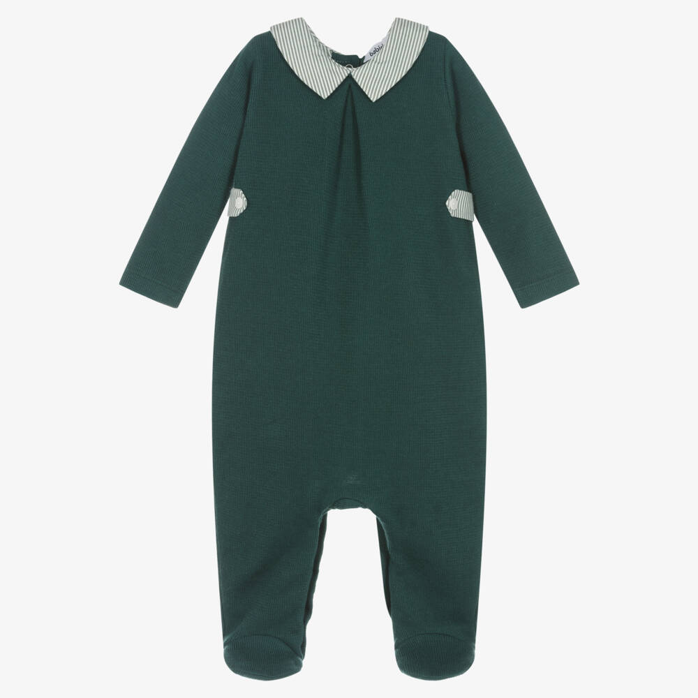 Forest green knitted babygrow for boys by Babidu, made from soft cotton with a fleecy interior. It has an adorable green and white striped, cotton collar with matching buttoned trims. There are popper fastenings on the back and between the legs for easy changing.