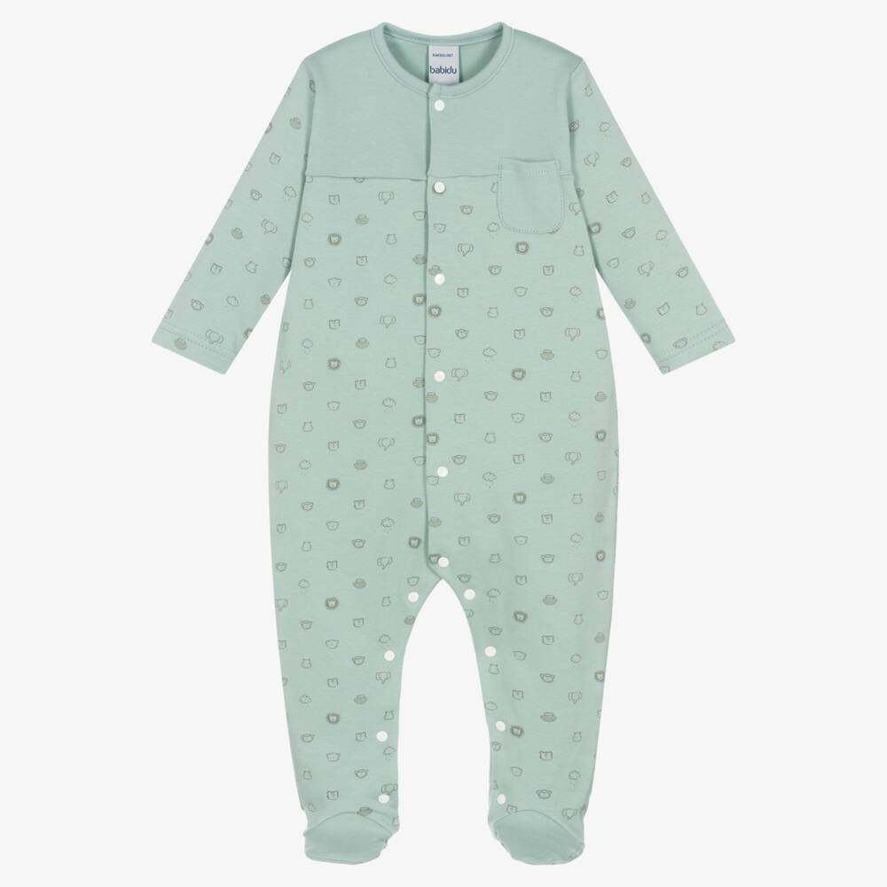 Cute sea green cotton babygrow for boys by Babidu, printed in an adorable Noah's Arc print with animals and rain clouds. Made from soft jersey, this babysuit has a simple crew neckline and patch pocket on the chest. The practical popper fastenings on the front and between the legs help with easy changing.